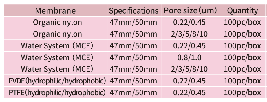 * Variety of membranes: The filer membrane made of different materials, such as Nylon,MCE, PTFE and PVDF etc. can be provided. To offer separation and purification solutions for the majority of your laboratory needs.