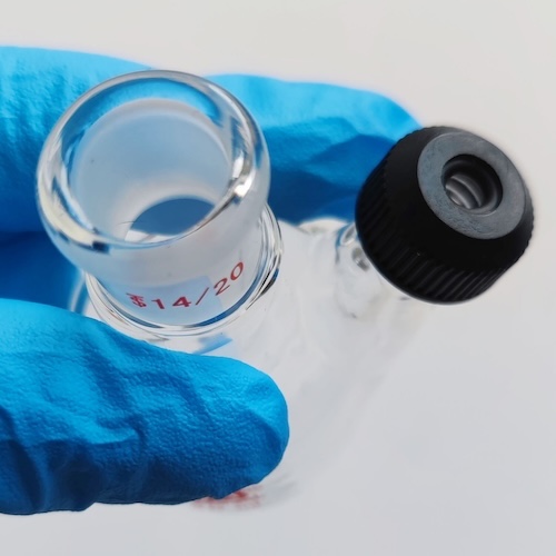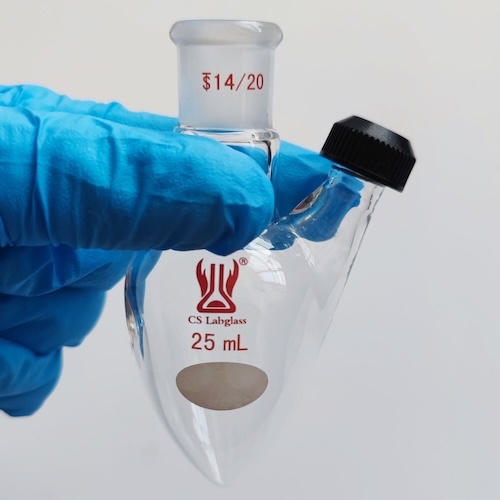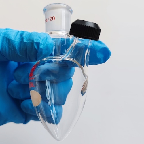 Pear-shaped flasks are typically used for evaporating solutions to dryness post synthesis using a rotary evaporator. The ’rounded V’ shape of the flasks enables solid materials to be scraped out more efficiently than from a round bottomed flask.