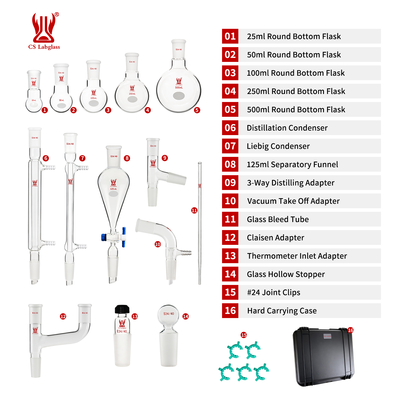* Durable and Reusable: The glassware set can be heated directly in an open fire and can withstand typical laboratory thermal changes in chemical processes such as heating and cooling, making them durable and reusable for your experiments.