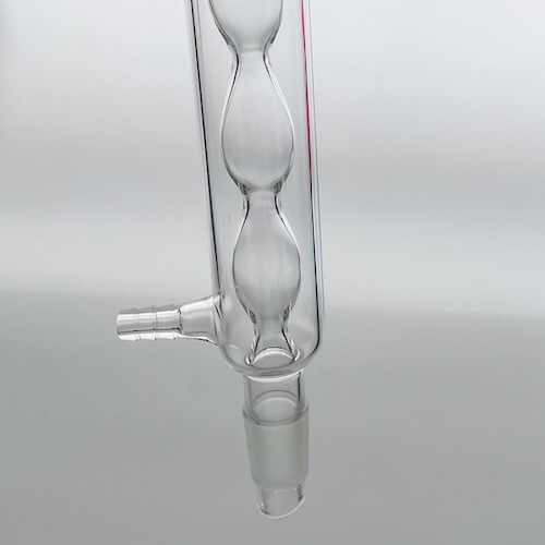 ✔ The Allihn condenser also known as a “bulb condenser”, is designed with an inner tube consisting of a series of bulbs which increase the surface area available for vapor condensation surrounded by an outer jacket tube, the cool water flows through the outer jacket to condensate the vapor in the inner tube.