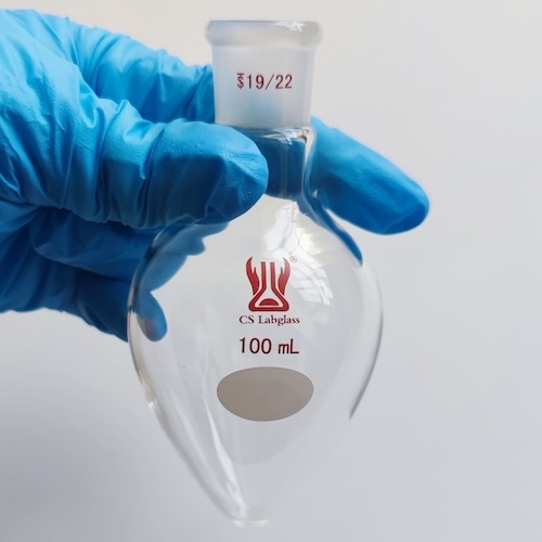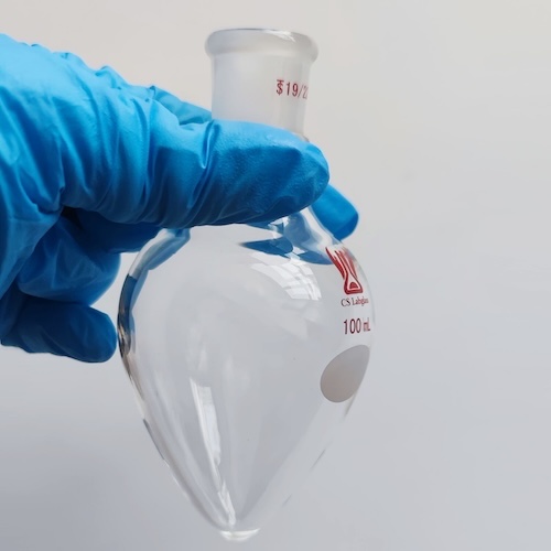 Pear-shaped flasks are typically used for evaporating solutions to dryness post synthesis using a rotary evaporator. The ’rounded V’ shape of the flasks enables solid materials to be scraped out more efficiently than from a round bottomed flask.